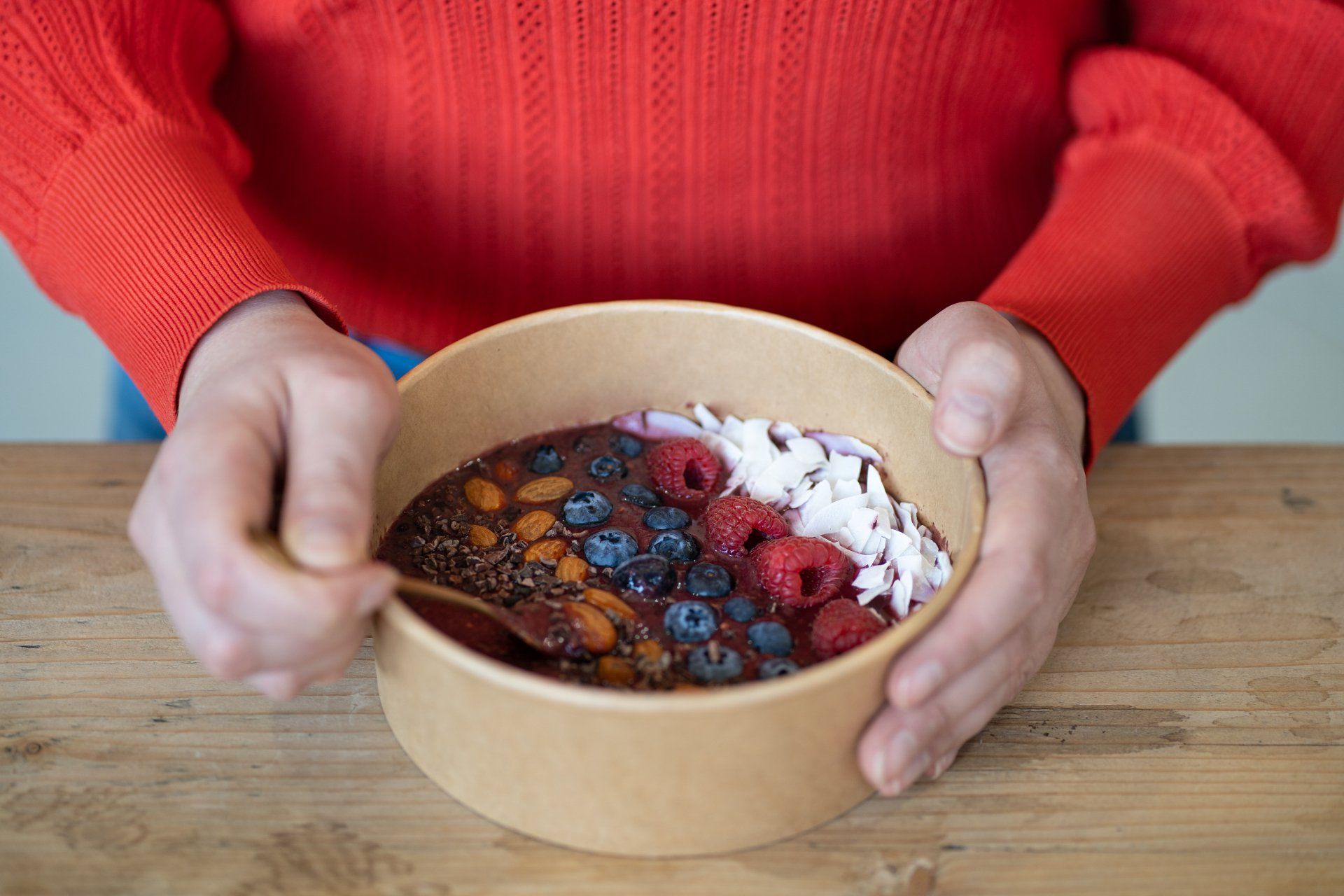 - Versier de bowl met de kokosrasp, cacaorasp, amandelen, frambozen en bosbessen.